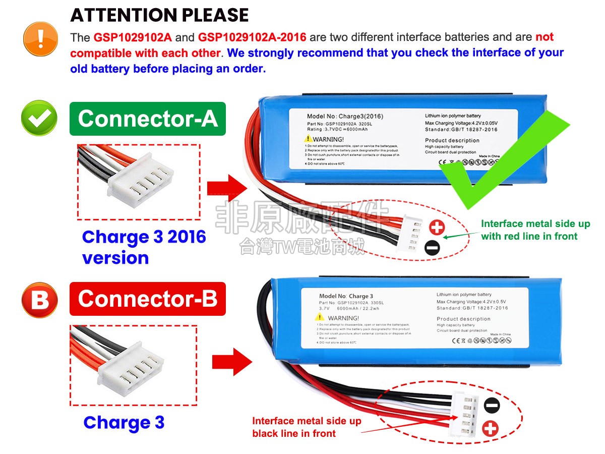 台灣TW電池商城售賣的所有電池均為100%真實容量,我們絕不會在參數上造假。對於製造商提供的每一款電池,我們都會安排技術人員進行參數測試,以確保我們售賣的電池都符合各種認證的要求、100%安全和100%兼容對應的音箱。極少數情況下,電池參數表上的容量會比電池實物圖上的容量低,這是因為我們檢測時發現製造商給出的電池容量偏高,與電池實際容量不符。於是我們會把電池的實際容量準確地填寫在參數表上,讓顧客直接看到電池的真實容量!這款JBL GSP1029102A-2016電池和原廠有什麼區別?