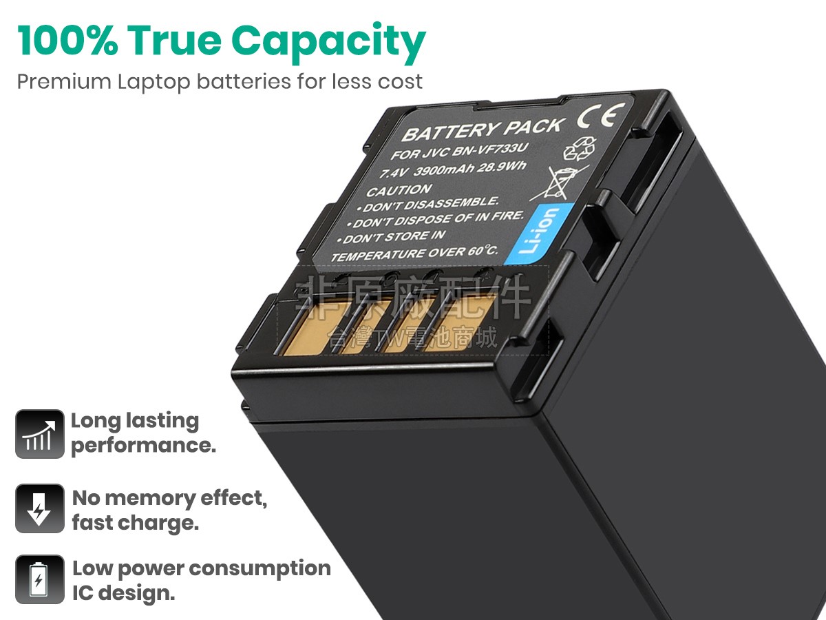 台灣TW電池商城售賣的所有電池均為100%真實容量,我們絕不會在參數上造假。對於製造商提供的每一款電池,我們都會安排技術人員進行參數測試,以確保我們售賣的電池都符合各種認證的要求、100%安全和100%兼容。極少數情況下,電池參數表上的容量會比電池實物圖上的容量低,這是因為我們檢測時發現製造商給出的電池容量偏高,與電池實際容量不符。於是我們會把電池的實際容量準確地填寫在參數表上,讓顧客直接看到電池的真實容量!這款JVC BN-VF733電池和原廠有什麼區別?