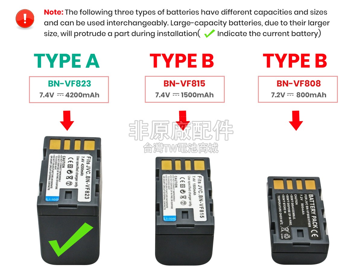 台灣TW電池商城售賣的所有電池均為100%真實容量,我們絕不會在參數上造假。對於製造商提供的每一款電池,我們都會安排技術人員進行參數測試,以確保我們售賣的電池都符合各種認證的要求、100%安全和100%兼容。極少數情況下,電池參數表上的容量會比電池實物圖上的容量低,這是因為我們檢測時發現製造商給出的電池容量偏高,與電池實際容量不符。於是我們會把電池的實際容量準確地填寫在參數表上,讓顧客直接看到電池的真實容量!這款JVC BN-VF809電池和原廠有什麼區別?