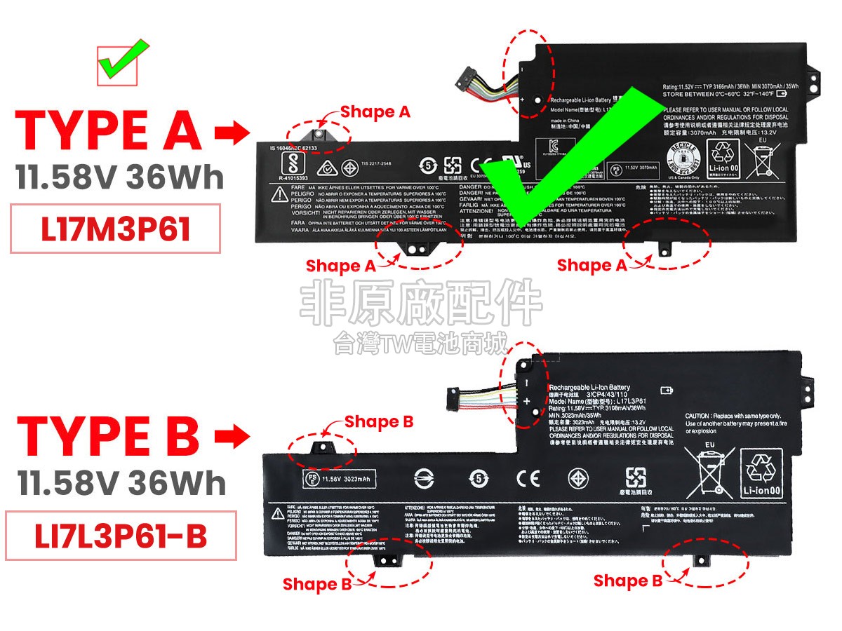 台灣TW電池商城售賣的所有電池均為100%真實容量,我們絕不會在參數上造假。對於製造商提供的每一款電池,我們都會安排技術人員進行參數測試,以確保我們售賣的電池都符合各種認證的要求、100%安全和100%兼容對應的筆記型電腦。極少數情況下,電池參數表上的容量會比電池實物圖上的容量低,這是因為我們檢測時發現製造商給出的電池容量偏高,與電池實際容量不符。於是我們會把電池的實際容量準確地填寫在參數表上,讓顧客直接看到電池的真實容量!這款Lenovo IdeaPad 320S-13IKB-81AK007DSP電池和原廠有什麼區別?