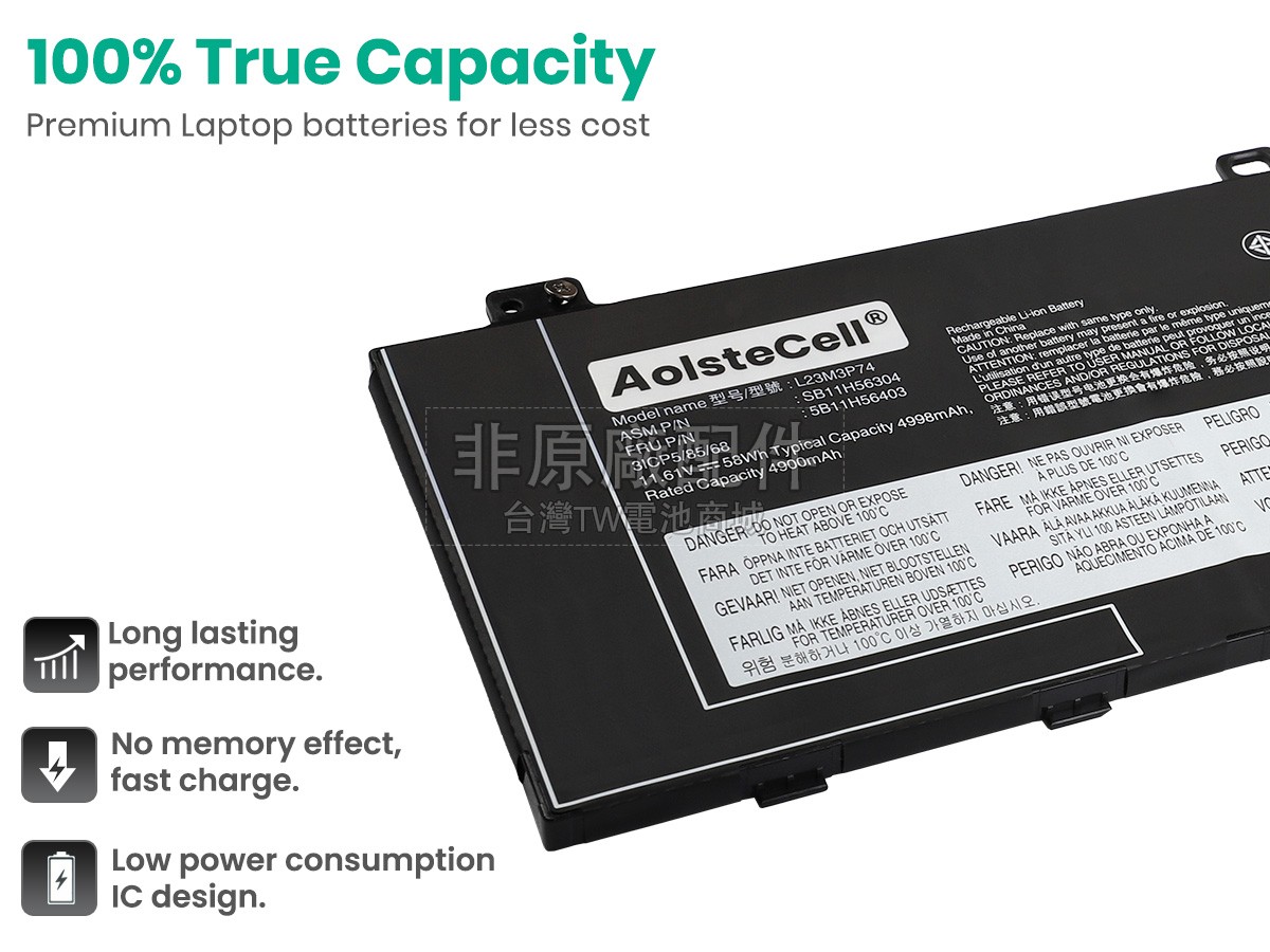 台灣TW電池商城售賣的所有電池均為100%真實容量,我們絕不會在參數上造假。對於製造商提供的每一款電池,我們都會安排技術人員進行參數測試,以確保我們售賣的電池都符合各種認證的要求、100%安全和100%兼容對應的筆記型電腦。極少數情況下,電池參數表上的容量會比電池實物圖上的容量低,這是因為我們檢測時發現製造商給出的電池容量偏高,與電池實際容量不符。於是我們會把電池的實際容量準確地填寫在參數表上,讓顧客直接看到電池的真實容量!這款Lenovo L23M3P74電池和原廠有什麼區別?