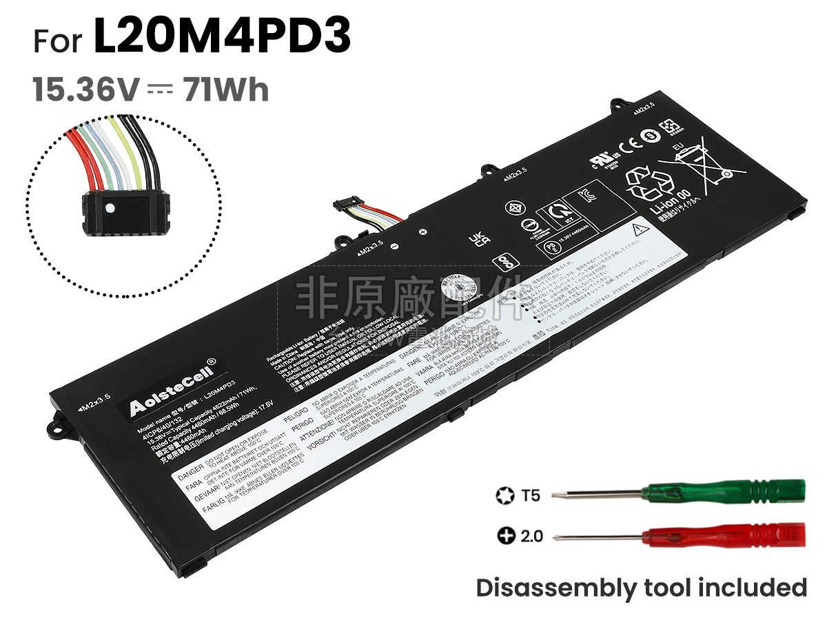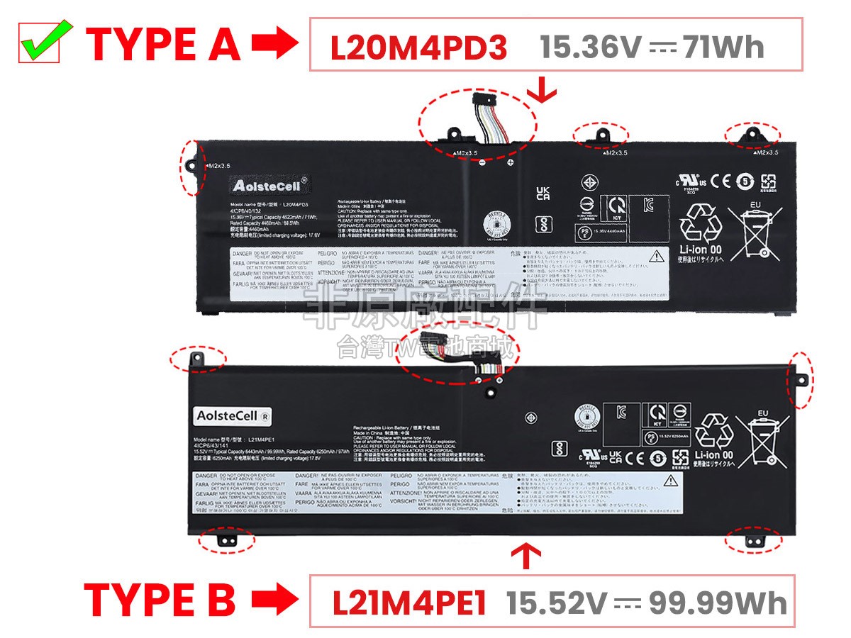 台灣TW電池商城售賣的所有電池均為100%真實容量,我們絕不會在參數上造假。對於製造商提供的每一款電池,我們都會安排技術人員進行參數測試,以確保我們售賣的電池都符合各種認證的要求、100%安全和100%兼容對應的筆記型電腦。極少數情況下,電池參數表上的容量會比電池實物圖上的容量低,這是因為我們檢測時發現製造商給出的電池容量偏高,與電池實際容量不符。於是我們會把電池的實際容量準確地填寫在參數表上,讓顧客直接看到電池的真實容量!這款Lenovo THINKBOOK 16P G2 ACH-20YM000FPK電池和原廠有什麼區別?