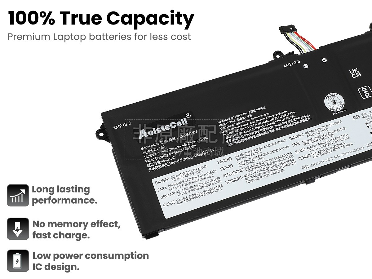 筆電電池好不好要看“芯”,內置電芯是筆電電池最重要的組成部分。 我們的LENOVO聯想THINKBOOK 16P G2 ACH-20YM000FPK筆記型電腦電池都是採用原廠品質的A+級電芯組裝而成,確保更好的安全性,更長的供電時間和更久的使用壽命。