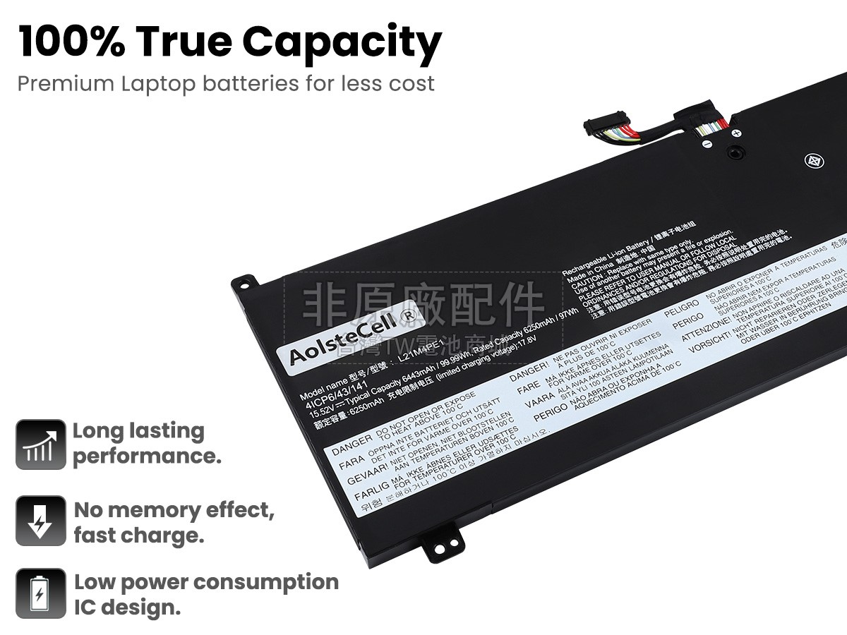 台灣TW電池商城售賣的所有電池均為100%真實容量,我們絕不會在參數上造假。對於製造商提供的每一款電池,我們都會安排技術人員進行參數測試,以確保我們售賣的電池都符合各種認證的要求、100%安全和100%兼容對應的筆記型電腦。極少數情況下,電池參數表上的容量會比電池實物圖上的容量低,這是因為我們檢測時發現製造商給出的電池容量偏高,與電池實際容量不符。於是我們會把電池的實際容量準確地填寫在參數表上,讓顧客直接看到電池的真實容量!這款Lenovo YOGA 7 16IAH7-82UF006EBM電池和原廠有什麼區別?