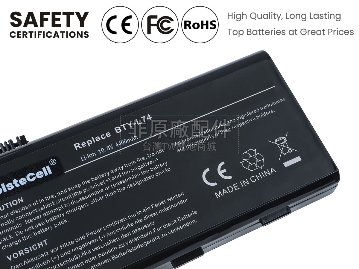 除了使用好的材料外,TW電池商城還以更高的行業標準檢測產品,目前我們的MSI 957-173XXP-101手提電腦電池已經通過日本PSE強制認證、歐盟RoHS環保認證、CE安全認證、美國FCC認證和MSDS化學品安全認證。