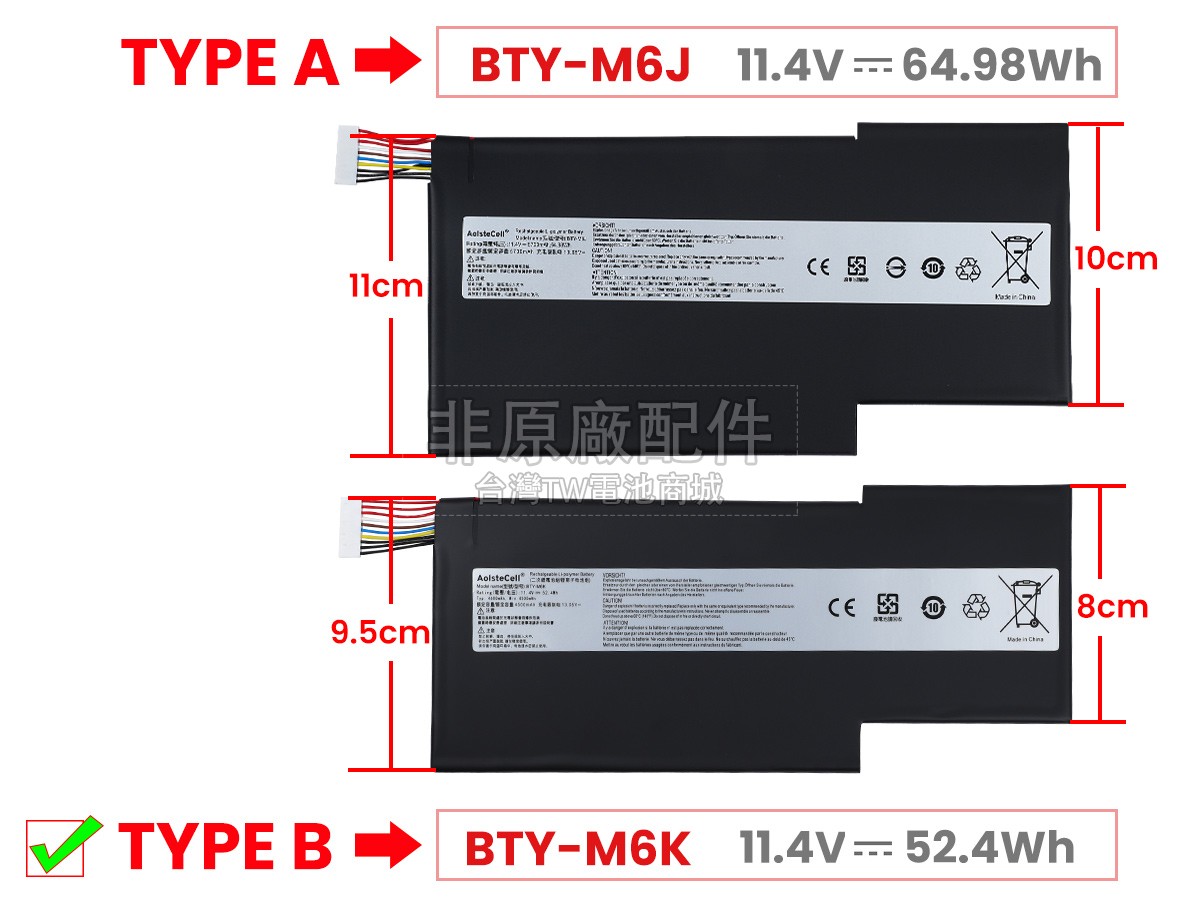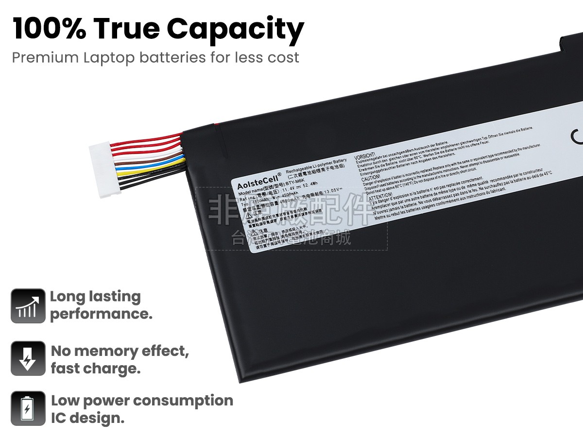 台灣TW電池商城售賣的所有電池均為100%真實容量,我們絕不會在參數上造假。對於製造商提供的每一款電池,我們都會安排技術人員進行參數測試,以確保我們售賣的電池都符合各種認證的要求、100%安全和100%兼容對應的筆記型電腦。極少數情況下,電池參數表上的容量會比電池實物圖上的容量低,這是因為我們檢測時發現製造商給出的電池容量偏高,與電池實際容量不符。於是我們會把電池的實際容量準確地填寫在參數表上,讓顧客直接看到電池的真實容量!這款MSI CREATOR 15M A9SD-065JP電池和原廠有什麼區別?