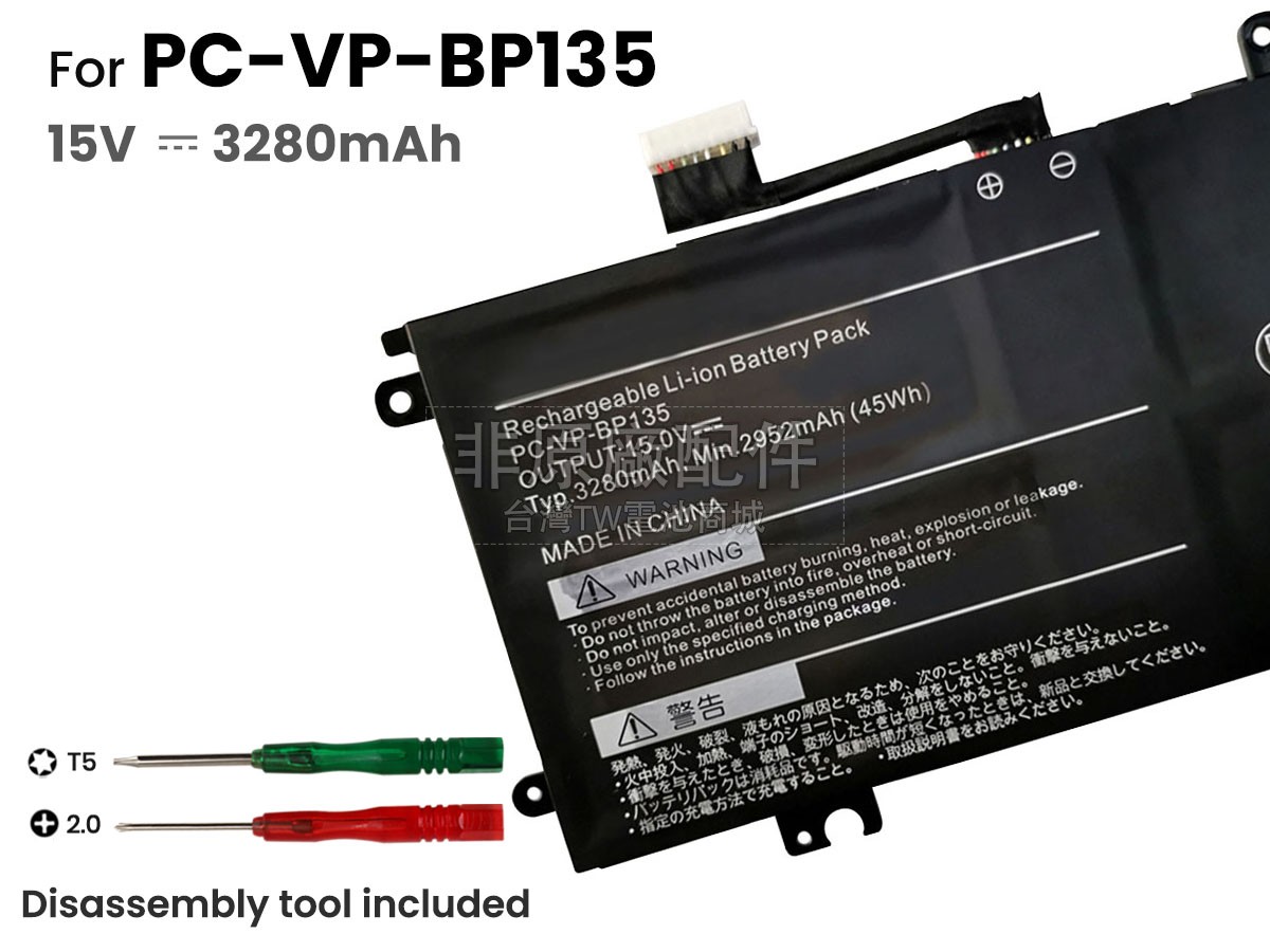 台灣TW電池商城售賣的所有電池均為100%真實容量,我們絕不會在參數上造假。對於製造商提供的每一款電池,我們都會安排技術人員進行參數測試,以確保我們售賣的電池都符合各種認證的要求、100%安全和100%兼容對應的筆記型電腦。極少數情況下,電池參數表上的容量會比電池實物圖上的容量低,這是因為我們檢測時發現製造商給出的電池容量偏高,與電池實際容量不符。於是我們會把電池的實際容量準確地填寫在參數表上,讓顧客直接看到電池的真實容量!這款NEC PC-VP-BP135電池和原廠有什麼區別?