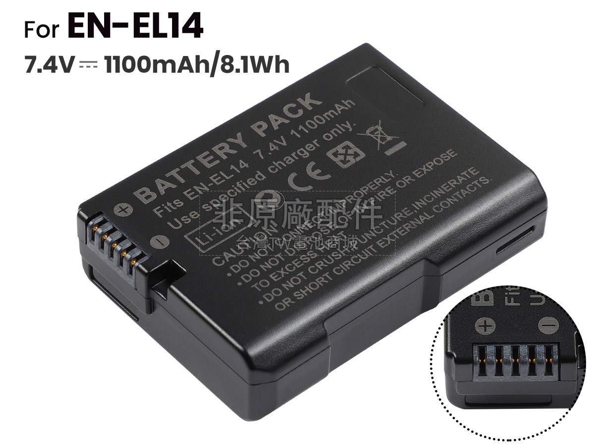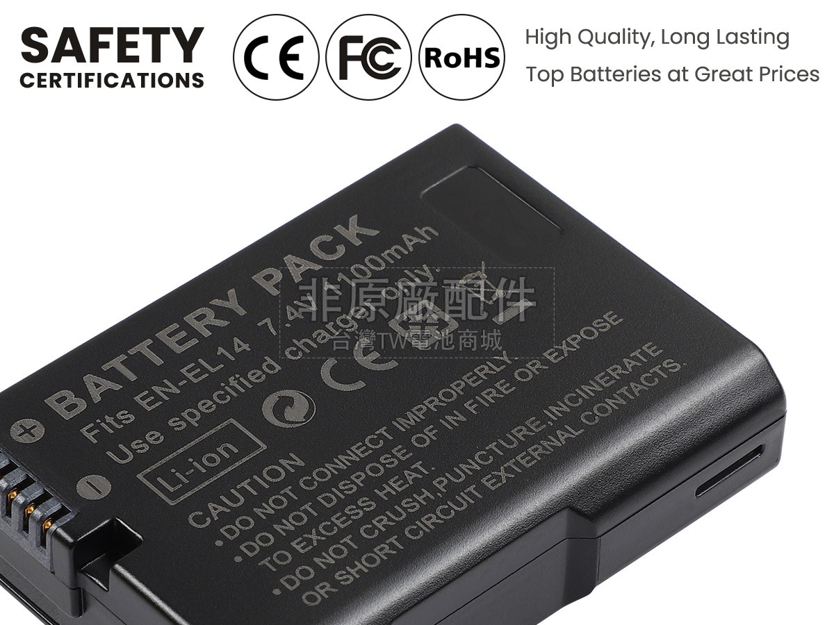台灣TW電池商城售賣的所有電池均為100%真實容量,我們絕不會在參數上造假。對於製造商提供的每一款電池,我們都會安排技術人員進行參數測試,以確保我們售賣的電池都符合各種認證的要求、100%安全和100%兼容。極少數情況下,電池參數表上的容量會比電池實物圖上的容量低,這是因為我們檢測時發現製造商給出的電池容量偏高,與電池實際容量不符。於是我們會把電池的實際容量準確地填寫在參數表上,讓顧客直接看到電池的真實容量!這款Nikon D5200電池和原廠有什麼區別?
