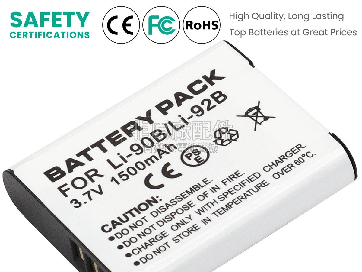 除了使用好的材料外,TW電池商城還以更高的行業標準檢測產品,目前我們的Olympus LI-90B電池已經通過日本PSE強制認證、歐盟RoHS環保認證、CE安全認證、美國FCC認證和MSDS化學品安全認證。