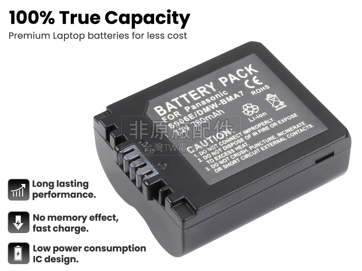 台灣TW電池商城售賣的所有電池均為100%真實容量,我們絕不會在參數上造假。對於製造商提供的每一款電池,我們都會安排技術人員進行參數測試,以確保我們售賣的電池都符合各種認證的要求、100%安全和100%兼容。極少數情況下,電池參數表上的容量會比電池實物圖上的容量低,這是因為我們檢測時發現製造商給出的電池容量偏高,與電池實際容量不符。於是我們會把電池的實際容量準確地填寫在參數表上,讓顧客直接看到電池的真實容量!這款Panasonic CGR-S006E電池和原廠有什麼區別?