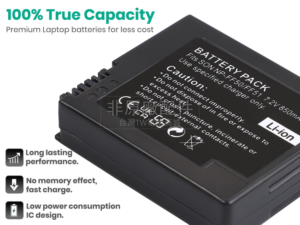 台灣TW電池商城售賣的所有電池均為100%真實容量,我們絕不會在參數上造假。對於製造商提供的每一款電池,我們都會安排技術人員進行參數測試,以確保我們售賣的電池都符合各種認證的要求、100%安全和100%兼容。極少數情況下,電池參數表上的容量會比電池實物圖上的容量低,這是因為我們檢測時發現製造商給出的電池容量偏高,與電池實際容量不符。於是我們會把電池的實際容量準確地填寫在參數表上,讓顧客直接看到電池的真實容量!這款Sony NP-FF70電池和原廠有什麼區別?