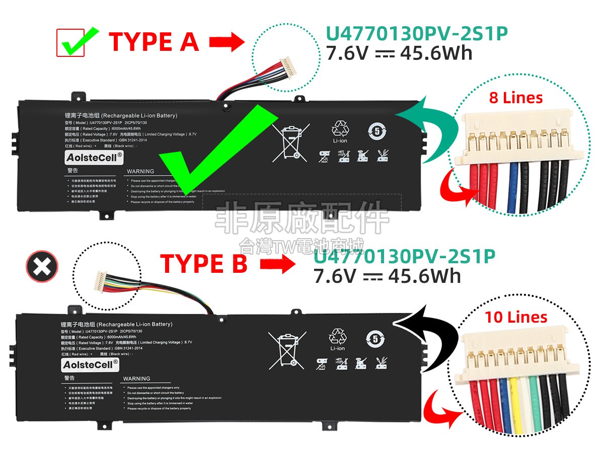台灣TW電池商城售賣的所有電池均為100%真實容量,我們絕不會在參數上造假。對於製造商提供的每一款電池,我們都會安排技術人員進行參數測試,以確保我們售賣的電池都符合各種認證的要求、100%安全和100%兼容對應的筆記型電腦。極少數情況下,電池參數表上的容量會比電池實物圖上的容量低,這是因為我們檢測時發現製造商給出的電池容量偏高,與電池實際容量不符。於是我們會把電池的實際容量準確地填寫在參數表上,讓顧客直接看到電池的真實容量!這款Teclast U4770130PV-2S1P(2ICP5/70/130)電池和原廠有什麼區別?