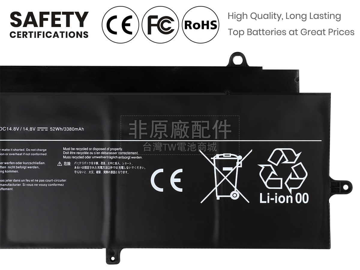 除了使用好的材料外,TW電池商城還以更高的行業標準檢測產品,目前我們的Toshiba KIRA-AT01S手提電腦電池已經通過日本PSE強制認證、歐盟RoHS環保認證、CE安全認證、美國FCC認證和MSDS化學品安全認證。