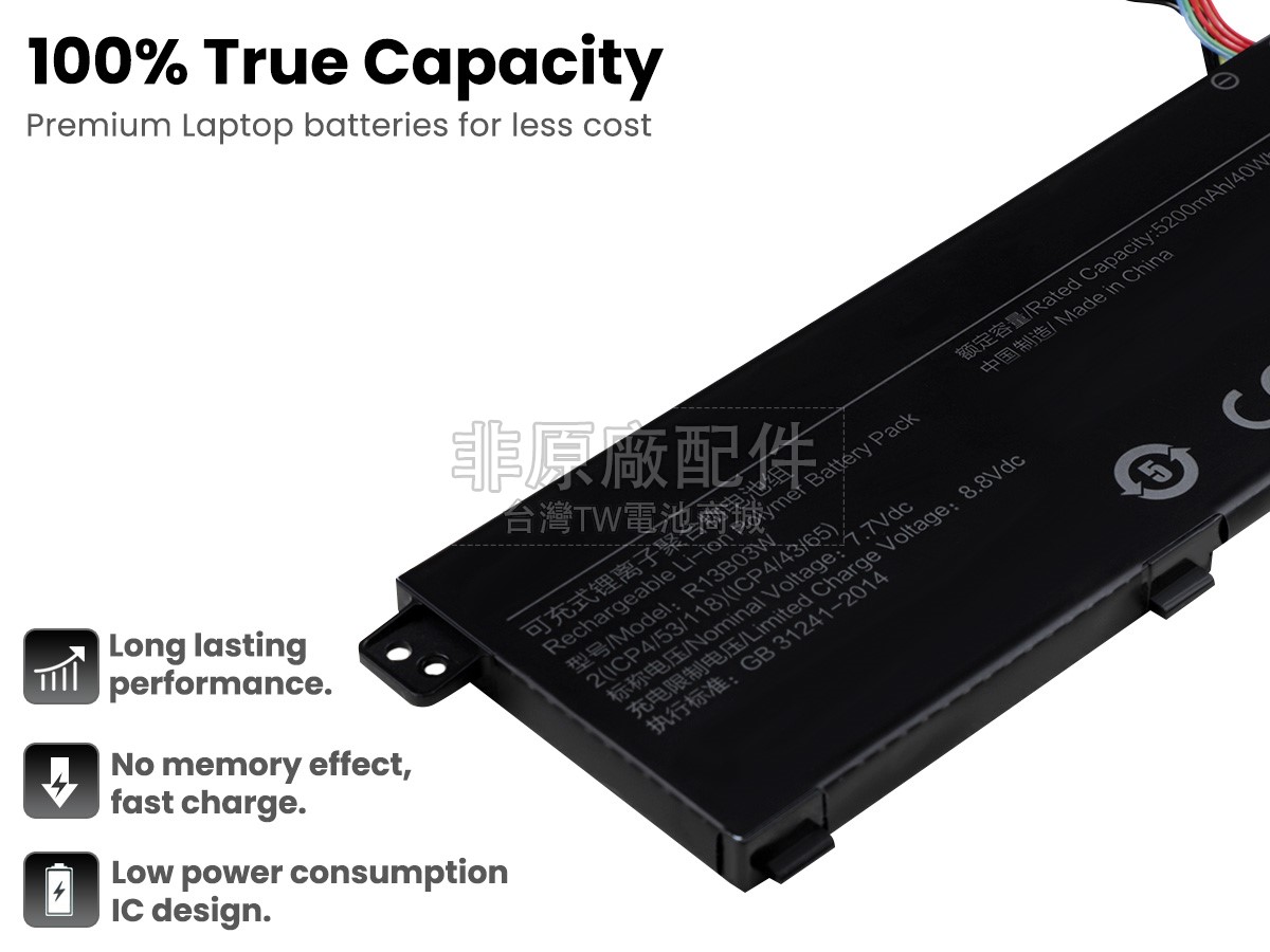 台灣TW電池商城售賣的所有電池均為100%真實容量,我們絕不會在參數上造假。對於製造商提供的每一款電池,我們都會安排技術人員進行參數測試,以確保我們售賣的電池都符合各種認證的要求、100%安全和100%兼容對應的筆記型電腦。極少數情況下,電池參數表上的容量會比電池實物圖上的容量低,這是因為我們檢測時發現製造商給出的電池容量偏高,與電池實際容量不符。於是我們會把電池的實際容量準確地填寫在參數表上,讓顧客直接看到電池的真實容量!這款XiaoMi XMA1903-AF電池和原廠有什麼區別?